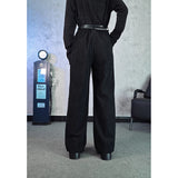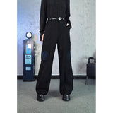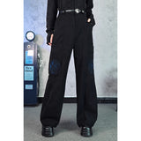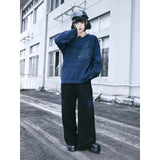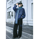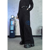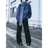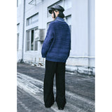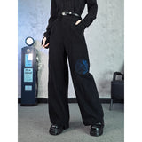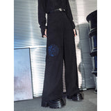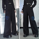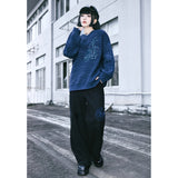 深く沈んだ夜の色をまとったコーデュロイパンツ。しっかりとした質感の黒い生地が縦のラインを強調しながら、無駄のないストレートからワイドへと落ちるシルエットで、足運びに静かな重みと余裕を与えています。腿のあたりに浮かび上がる青の刺繍は、優雅な曲線を描きながら渦を巻く闘魚〈ベタ〉の姿を象り、静止しているにもかかわらず、今にも水を切り裂いて舞い上がりそうな緊張感と攻撃性を秘めています。