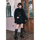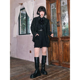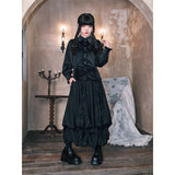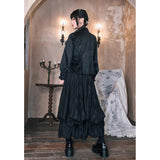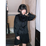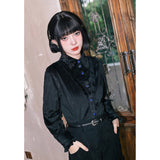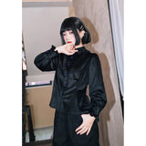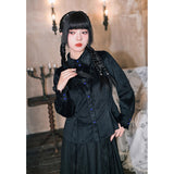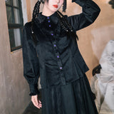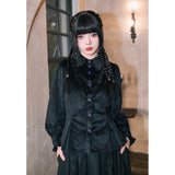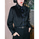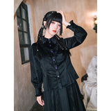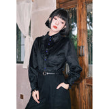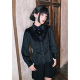 深い黒を基調に、しっとりとした質感の生地が身体に沿って静かに落ちるブラウス。立体的に設計されたウエストラインと控えめなペプラム調の切り替えが、端正さの中にわずかな緊張感を宿しています。襟元には、闇の中でひそやかに息づく闘魚〈ベタ〉を思わせる刺繍が施され、流れるような曲線と細やかな糸運びが、美しさと内に秘めた攻撃性を同時に語りかけます。