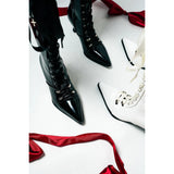 ゴシックロリータの世界観を象徴するレースアップブーツ。つま先は鋭く伸びたポインテッドトゥ、細くしなやかなヒールが縦のラインを強調し、クラシカルでありながらどこか幻想的なシルエットをつくっています。存在感のある編み上げは装飾性が高く、金具や十字架モチーフのチャームが揺れて、甘さの中に厳かな祈りのようなニュアンスを醸し出しています。