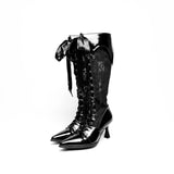 ゴシックロリータの世界観を象徴するレースアップブーツ。つま先は鋭く伸びたポインテッドトゥ、細くしなやかなヒールが縦のラインを強調し、クラシカルでありながらどこか幻想的なシルエットをつくっています。存在感のある編み上げは装飾性が高く、金具や十字架モチーフのチャームが揺れて、甘さの中に厳かな祈りのようなニュアンスを醸し出しています。