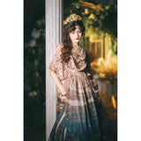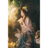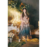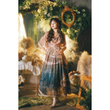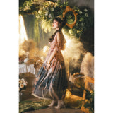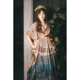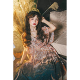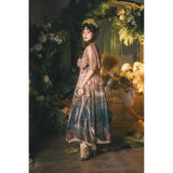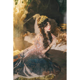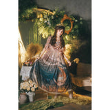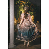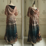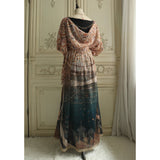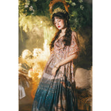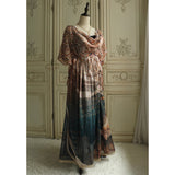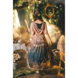 古代の叙事詩をそのまま纏ったような、幻想的な雰囲気を放つワンピース。柔らかく落ち感のある生地に、物語の断片が刻まれたようなアラビアンテイストのイラストが連なり、全体が一枚の絵巻物のように仕立てられています。胸元はゆるやかなドレープが美しいカウルネックで、背中にも同じく優雅なドレープが流れ、光と影を含むようにふんわりと揺れます。ウエストには繊細な金チェーンが複数重なり、砂漠の星空や古城のシルエットが描かれたスカートへと自然につながり、異国の夜を思わせる神秘的な深いブルーへとグラデーションしていきます。裾には細やかなレーストリムが施され、旅情と優雅さを一層引き立てます。まるで遥か異国の物語から抜け出したヒロインみたいに。