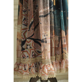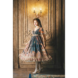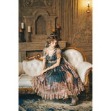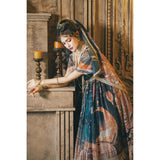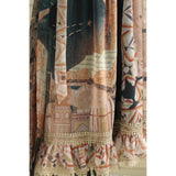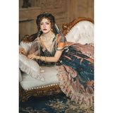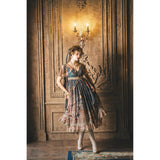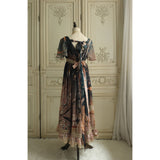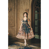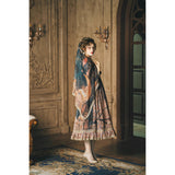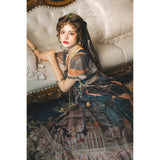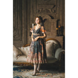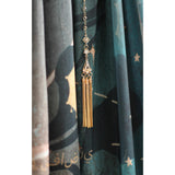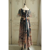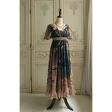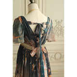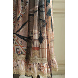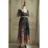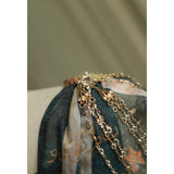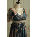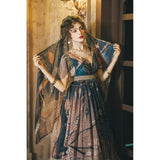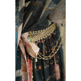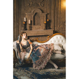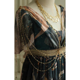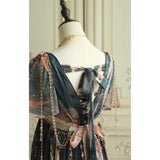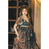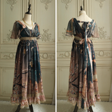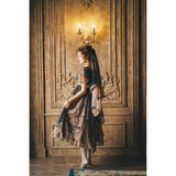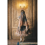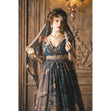 古代の叙事詩をそのまま纏ったような、幻想的な雰囲気を放つワンピース。薄霧のように透ける生地に神秘的なアラベスク調のプリントが重なり、物語の断片をそのまま纏ったかのよう。織りなすグラデーションに、星々や古代建築を思わせるモチーフが散りばめられ、裾には繊細なレースとフリルが揺れ、まるで砂漠の夜風が運んできた詩のような余韻を残します。胸元は柔らかくドレープが流れ、ハイウエストのレースベルトには繊細なゴールドチェーンが幾重にも連なり、歩くたびに星屑のようにきらめきます。背中にはリボンと編み上げがあしらわれ、後ろ姿まで優美で物語性に満ち、砂漠の宮殿で踊る舞姫のような気品と神秘をたたえたアイテム。