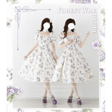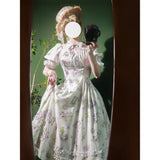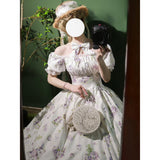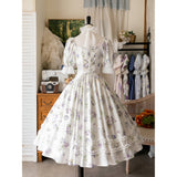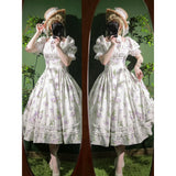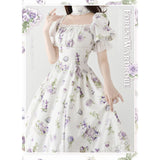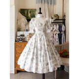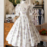 19世紀のヴィクトリア朝時代を彷彿とさせる優雅で洗練されたワンピース。淡い色の花をつけた三色菫と、薄紫色の薔薇の花が水彩で描かれています。膨らみのある袖と、ウエストラインが強調されたデザインが特徴的。ネックライン、袖口、裾部分にはフリル、バックには編み上げが装飾されています。時代を超えて輝く永遠のスタイル。