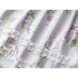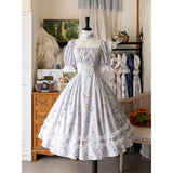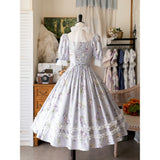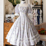 19世紀のヴィクトリア朝時代を彷彿とさせる優雅で洗練されたワンピース。淡い色の花をつけた三色菫と、薄紫色の薔薇の花が水彩で描かれています。膨らみのある袖と、ウエストラインが強調されたデザインが特徴的。ネックライン、袖口、裾部分にはフリル、バックには編み上げが装飾されています。時代を超えて輝く永遠のスタイル。