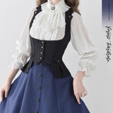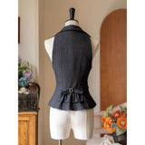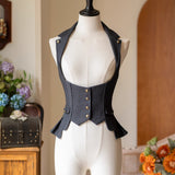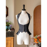 クラシカルな仕立てを現代的に再構築したコルセットデザインのベスト。ウエストを絞る立体的なラインと、背面のリボンディテールが女性らしい曲線を美しく際立たせます。フロントにはアンティーク調のボタンを並べ、裾のフレアが優雅な余韻を添える。クラシックとモードが交錯する、知的で艶のあるヴィンテージライクなベスト。