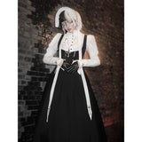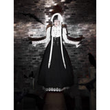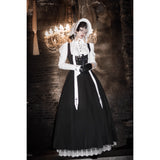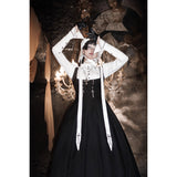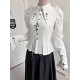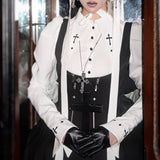 宗教的モチーフとゴシックロリータの美学を融合させたブラウス。シャープなロングカラーとふっくらと膨らんだパフスリーブが修道服を思わせる厳粛な造形を描き、袖口に刻まれた黒い十字架の刺繍が静かな意志を宿します。聖と罪、純潔と暗黒が紙一重で交錯するような、退廃的でありながら荘厳なアイテム。