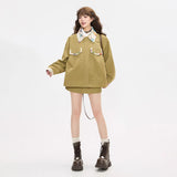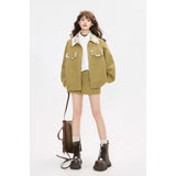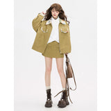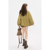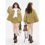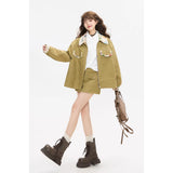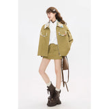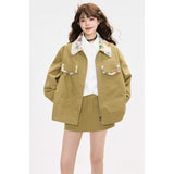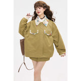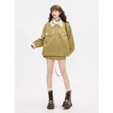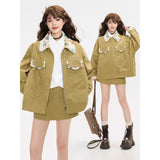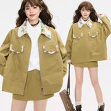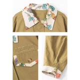 ゆったりとしたシルエットで仕立てられたワークテイストのジャケットとショートスカート。ジャケットは丸みを帯びたオーバーサイズのフォルムに大きめのフラップポケットを配し、胸元にはさりげないロゴ刺繍をあしらっています。さらに襟やポケット口、袖口の折り返し部分に繊細なボタニカル柄の生地を切り替えることで、無骨さの中に柔らかな華やぎを忍ばせたデザインに仕上げられています。スカートはコンパクトな丈感とすっきりとした台形シルエットが脚を軽やかに見せ、シンプルながらもジャケットとのバランスが計算されたデザイン。ナチュラルでクラシカルな雰囲気と現代的なストリート感をさりげなく融合させたコーディネート。