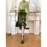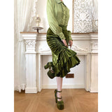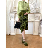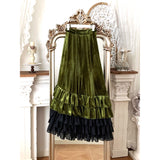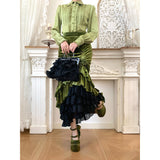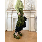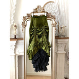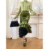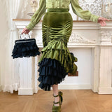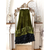 ベルベットにフリルを重ねた華やかでドラマティックなマーメイドスカート。中央に寄せたドレープが美しい陰影をつくり、重ねられたティアードフリルは、動くたびに揺れ、ベルベットの重厚さとシフォンの軽やかさが対比することで、幻想的でゴシックな魅力を際立たせています。正面からも横からも、そして後ろ姿までも優雅。クラシカルで官能的な存在感をまとったアイテム。