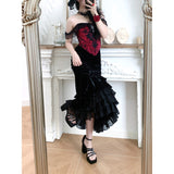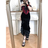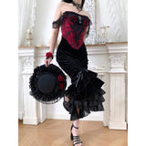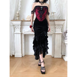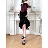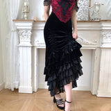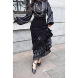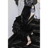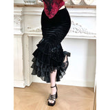 ベルベットにフリルを重ねた華やかでドラマティックなマーメイドスカート。中央に寄せたドレープが美しい陰影をつくり、重ねられたティアードフリルは、動くたびに揺れ、ベルベットの重厚さとシフォンの軽やかさが対比することで、幻想的でゴシックな魅力を際立たせています。正面からも横からも、そして後ろ姿までも優雅。クラシカルで官能的な存在感をまとったアイテム。
