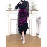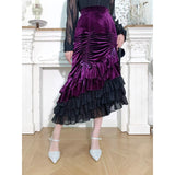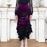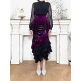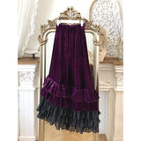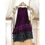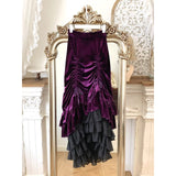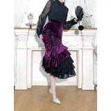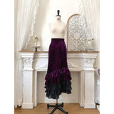 ベルベットにフリルを重ねた華やかでドラマティックなマーメイドスカート。中央に寄せたドレープが美しい陰影をつくり、重ねられたティアードフリルは、動くたびに揺れ、ベルベットの重厚さとシフォンの軽やかさが対比することで、幻想的でゴシックな魅力を際立たせています。正面からも横からも、そして後ろ姿までも優雅。クラシカルで官能的な存在感をまとったアイテム。