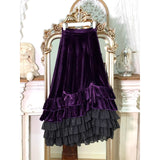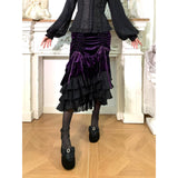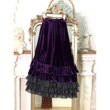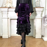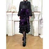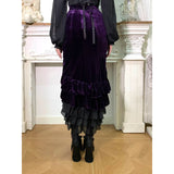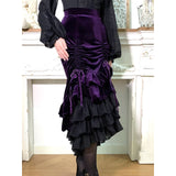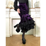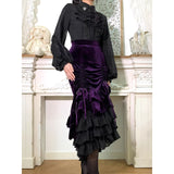 ベルベットにフリルを重ねた華やかでドラマティックなマーメイドスカート。中央に寄せたドレープが美しい陰影をつくり、重ねられたティアードフリルは、動くたびに揺れ、ベルベットの重厚さとシフォンの軽やかさが対比することで、幻想的でゴシックな魅力を際立たせています。正面からも横からも、そして後ろ姿までも優雅。クラシカルで官能的な存在感をまとったアイテム。
