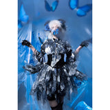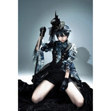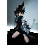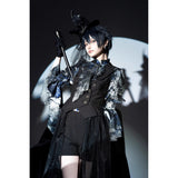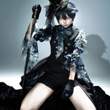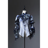 血飛沫と退廃的な白が織りなす、耽美で幻想的なブラウス。ボディを包む布地には、滲むような血塗れの模様が散っています。高く立ち上がる襟がクラシカルな荘厳さを演出し、袖口に重ねられたフリルは波のように流れ、動くたびに静かな悲鳴のような優雅さを描きます。儚さと狂気が同居する、耽美的世界へ。