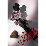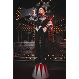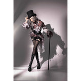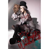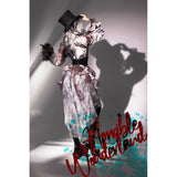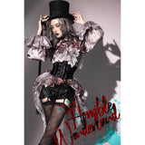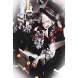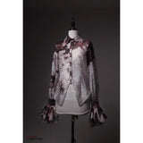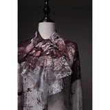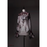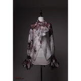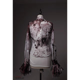 血飛沫と退廃的な白が織りなす、耽美で幻想的なブラウス。ボディを包む布地には、滲むような血塗れの模様が散っています。長い袖の先には広がるカフスとフリルが波打ち、クラシカルな優雅さの中に不穏な気配を漂わせます。儚さと狂気が同居する、耽美的世界へ。