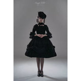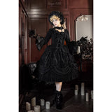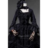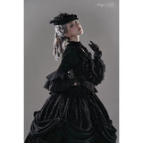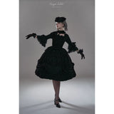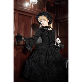 静寂と華美が同時に息づく、古い時代の夜会を思わせるブラウスとスカート。漆黒のブラウスは、繊細なレースとフリルを幾重にも重ねた構築的な佇まい。胸元から縦に連なるリボン装飾が静かな緊張感と装飾性を与え、バックには編み上げが施されています。スカートは、重厚な黒の織り柄生地をたっぷりと使い、バッスルを思わせるドレープと薔薇の装飾で立体的に吊り上げられ、裾からのぞくフリルが奥行きを生み出しています。
