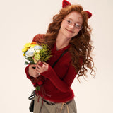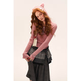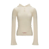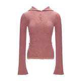 一枚で主役になれる、愛らしくも洗練された猫耳のついたフーディニットセーター。体のラインに寄り添うように編み上げられたリブニットが特徴的。控えめなフードと胸元のボタンがカジュアルな抜け感を添え、裾には繊細なフェザートリムが揺れる。甘さとモードが絶妙に交差するデザインで、小悪魔的な可愛さを併せ持っています。