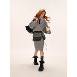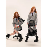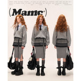 スウェットとリブニットを組み合わせた異素材ミックスのドッキングデザインのニットワンピース。上身頃はゆるやかなVネックのスウェット地で構成され、胸元と袖に施されたチェックパッチがアカデミックなアクセントを添えます。ウエストから下はタイトなリブニットスカートに切り替えられ、伸びやかな素材が女性らしいラインを引き立てます。カジュアルさとクラシカルな知性が同居する、スクールガールテイストのモダンワンピース。