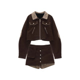 ダークブラウンの生地に、ベージュのチェック柄が襟元や袖を静かに縁取るショートジャケットとショート丈のスカートパンツ。ジャケットは、ドロップショルダーの緩やかな曲線が着る人を優しく包み込み、クラシカルな佇まいの中に都会的なリズムを刻んでいます。スカートパンツは、フロントに並ぶシルバーボタンが宝石のように輝き、裾から覗くチェック柄が秘密を明かすように姿を現す、遊び心溢れるレイヤードデザイン。