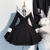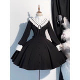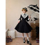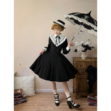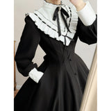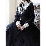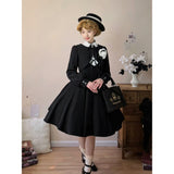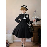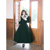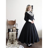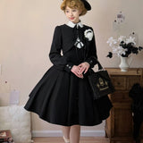 気品ある姿の凛とした佇まい。19世紀ヨーロッパの貴婦人のような洗練されたスタイルに演出してくれる。ショートジャケットは、肩から胸元にかけてすっきりとした構築的なラインを描き、控えめな丈感が内側のワンピースの広がりを引き立てます。ワンピースは高めのウエスト切り替えからなだらかにフレアを描くシルエットで、白いフリルカラーとリボンディテールが顔まわりに静かな可憐さを与えます。クラシカルで少しノスタルジックな気配をまとった装い。醸し出す気品に魅了されて。