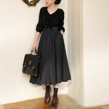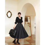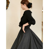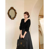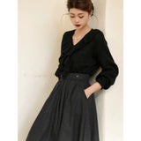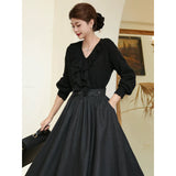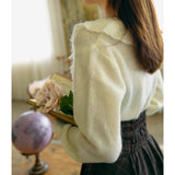 ロマンティックな優雅さと品の良さを兼ね備えたニットセーター。柔らかな質感のニットが身体を優しく包み、フロントにあしらわれた大きめのフリルが華やかさを添えています。Vネックのラインはデコルテを美しく見せ、顔まわりを明るく演出。ふんわりとした袖のシルエットがクラシカルな雰囲気を漂わせつつ、日常にも溶け込む軽やかさを感じさせます。清楚でありながら甘すぎない、大人のフェミニンスタイルにふさわしいニットセーター。