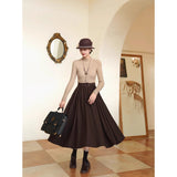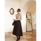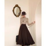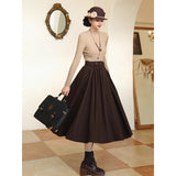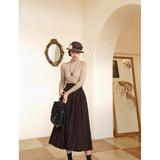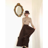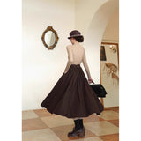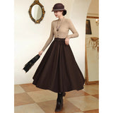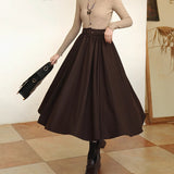 クラシカルな品格と女性らしい優雅さを併せ持つアンブレラスカート。たっぷりと生地を取ったフルサークルシルエットが、歩くたびに美しく波打ち、まるで映画のワンシーンのような雰囲気を演出します。しっかりとしたウール調の生地が季節感を添え、ハイウエストと太めのベルトデザインがスタイルをすっきりと見せてくれます。秋冬の装いに温かみと知的な印象を与える一着。