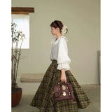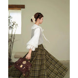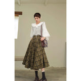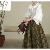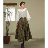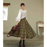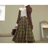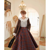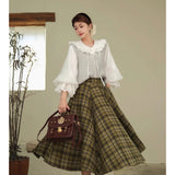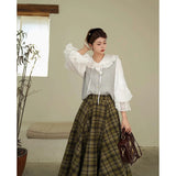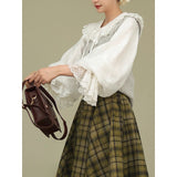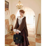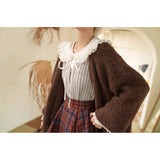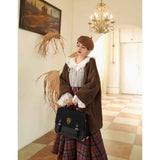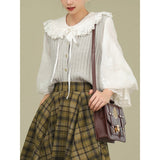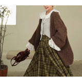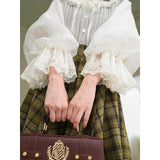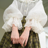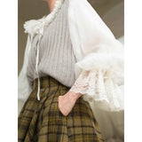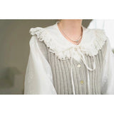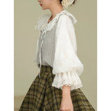 儚げな少女らしさと、落ち着いた知性を感じさせる、ヴィンテージライクなブラウスとベスト。ブラウスは透け感のある生地に繊細な花模様が浮かび、襟元と袖口にたっぷりとあしらわれたレースが華やかさを添えています。ボリュームのある袖が空気を含むように広がり、優雅な印象を演出。その上に重ねたリブ編みのベストは、柔らかなグレーが上品で、光沢のあるボタンが控えめなアクセント。可憐さとクラシカルな気品が溶け合ったロマンティックな組み合わせ。