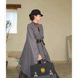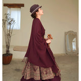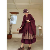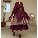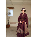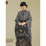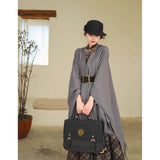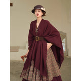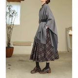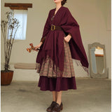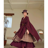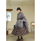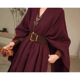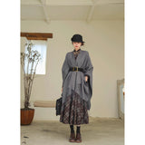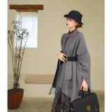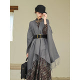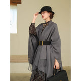 静かな気品とドラマティックな存在感を併せ持つクラシカルなロングショール滑らかな生地が身体を包み込み、肩から流れるドレープがまるで舞台衣装のように美しく広がります。フリンジの揺らめきが動きに柔らかさを添え、ウエストの太ベルトでシルエットを引き締めることで、上品さの中に凛とした強さを感じさせます。秋冬の装いに詩的な陰影を与えるショール。