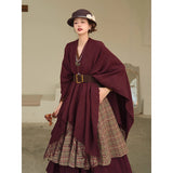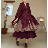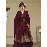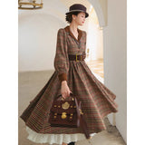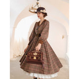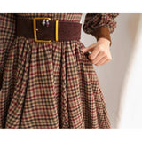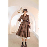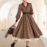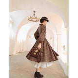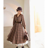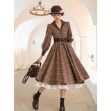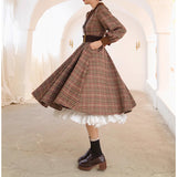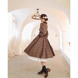 英国の古き良き時代を思わせるクラシカルなチェック柄ワンピース。ウエストをしっかりとマークする太ベルトがシルエットを引き締め、ふんわりと広がるスカートラインが優雅な存在感を放ちます。スエード調の襟とカフスが温かみを添え、全体にノスタルジックな気品を漂わせながらも、洗練された都会的な女性らしさを感じさせます。動くたびに裾から覗くレースのペチコートが、まるで物語のワンシーンのようにロマンティックな印象を残すワンピース。