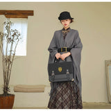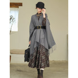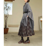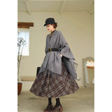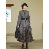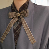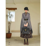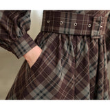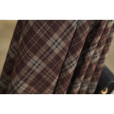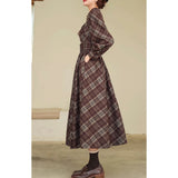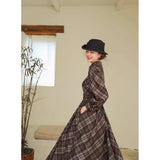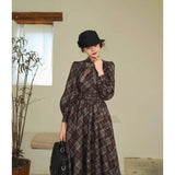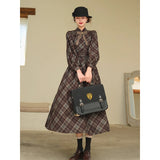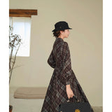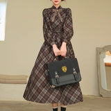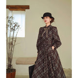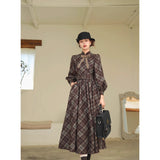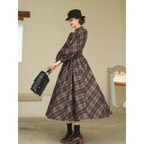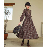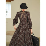 ヴィンテージ映画のヒロインのような雰囲気を演出してくれるクラシカルワンピース。深みのあるブラウンチェックが印象的。高めのスタンドカラーに、胸元のリボンタイと同柄のベルトが上品さを添え、控えめながらも知的な存在感を放ちます。ふんわりと膨らむスリーブとたっぷり広がるフレアシルエットが、動くたびに美しいラインを描きます。落ち着いた色合いの中に女性らしい優雅さと凛とした気品を感じさせる一着。