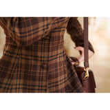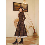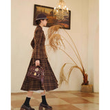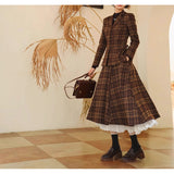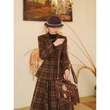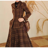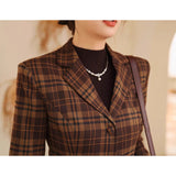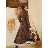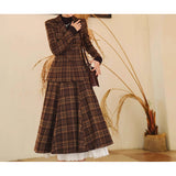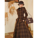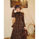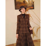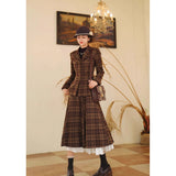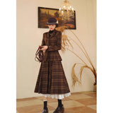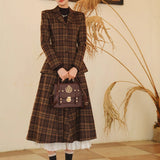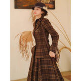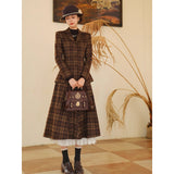 まるで19世紀の英国貴婦人のような端正なクラシカルエレガンスを醸し出しているジャケットとスカート。ブラウンを基調としたチェック柄が落ち着きと深みを感じさせ、ウエストラインを美しく描くジャケットは、構築的なシルエットで凛とした女性らしさを引き立てます。裾に向かって優雅に広がるロングスカートは、歩くたびに柔らかく揺れ、上品な余韻を残します。知的でありながらも温もりを感じさせてくれる装い。