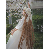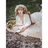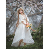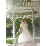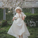 王侯貴族のお嬢様みたいに演出してくれるクラシカルなワンピース。肩まわりには大胆にフリルが装飾されており、胸元は透け感のある花柄レースが装飾されています。たっぷりの生地量で紡がれたドレープ感のある優雅なシルエット。さあ、今宵の舞踏会に出掛けましょう。