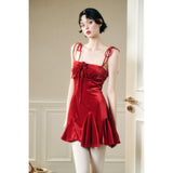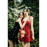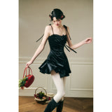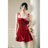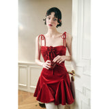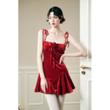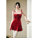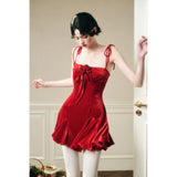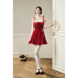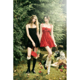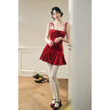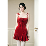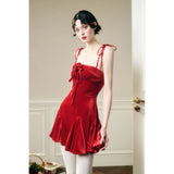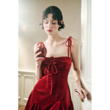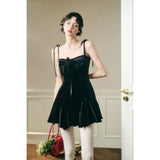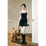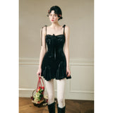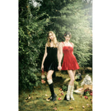 ロマンスの香りに誘われたお嬢様みたいに演出してくれるベルベットのストラップワンピース。胸元にはリボン装飾やフラワーモチーフが施され、肩紐は細く、長さ調整が可能となっています。裾部分にはフリルが施され、軽やかでエレガントな雰囲気を演出しています。ロマンティックな雰囲気たっぷり。