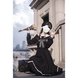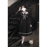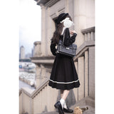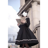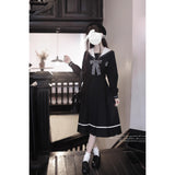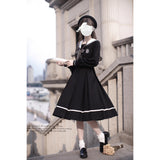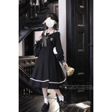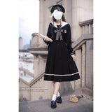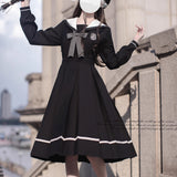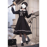 クラシカルで知的な佇まいを演出する、黒を基調としたセーラーワンピース。胸元には白のセーラー襟と大きめのリボンがあしらわれ、上品で清楚な印象を与えています。スカート部分はボックスプリーツで程よいボリュームを持たせ、裾には白いラインがアクセントとして施されています。全体的にシンプルながらも端正なデザインとなっています。