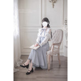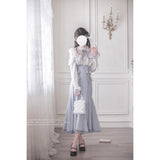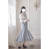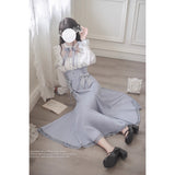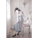 優雅さと可愛さを兼ね備えた令嬢のような、クラシカルな甘さを醸し出しているアイテム。フリルとレースを贅沢にあしらったトップスは、透け感のあるレースがエレガントな陰影を添え、肩を程よく見せるカッティングが華奢な印象を演出します。ロング丈のスカートは、流れるようなマーメイドシルエットに、しっかりとしたハードなコルセットを施したデザイン。裾部分にはレースが装飾されており、ロマンティックなムードを強調しています。
