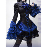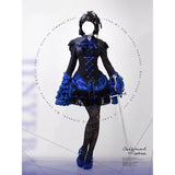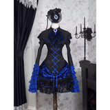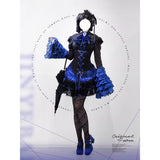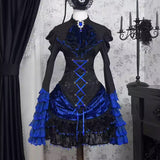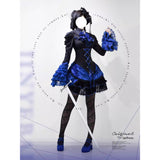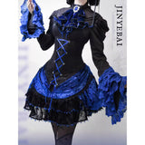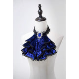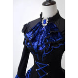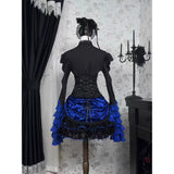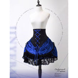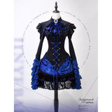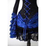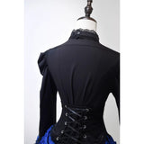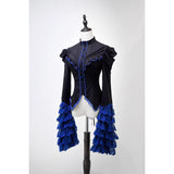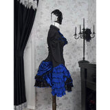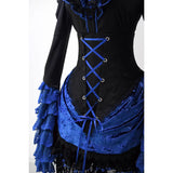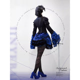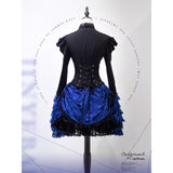 中世貴族のドレスとヴィクトリアンロリータが融合したような、華麗なお洋服。舞台衣装のように存在感がありながらも、繊細なディテールが詩的な空気を纏わせています。深いロイヤルブルーのフリルとレースが重ねられた、華やかでクラシカルなブラウスは、パフショルダーから広がるベルスリーブで、ブルーのレースが段重ねに装飾されており、貴族的なエレガンスを演出しています。鮮やかな青のベルベット生地と、黒のレースティアードを重ねたコルセットスカートは、裾部分にクラシカルなダマスク柄の透けレースが覗き、荘厳な雰囲気と官能性が共存しています。