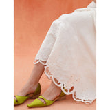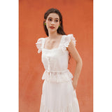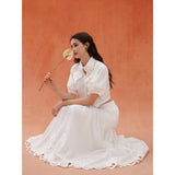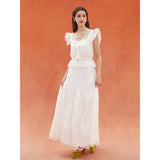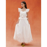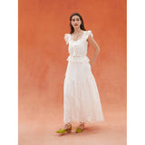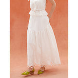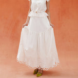 砂漠の大地で花をつけたサボテンを刺繍したスカート。裾に向かって広がるフレアシルエットで、たっぷりとギャザーの入ったティアードデザインが、風をはらんで軽やかに揺れます。甘さの中に清楚さと爽やかさが宿っています。