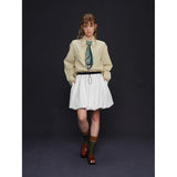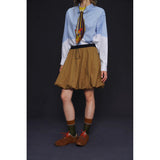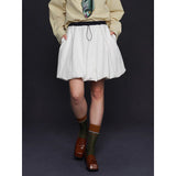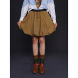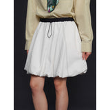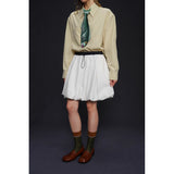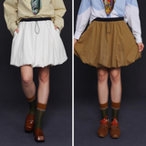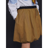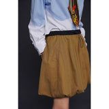まるで膨らんだ風船みたいなふんわりとしたフォルムのスカート。ユーモアと少女性の融合を取り入れたデザイン。裾のボリューム感に対し、ウエスト部分はドローコードのカジュアルな仕様となっています。モードとスポーティの対比を遊んでおり、現代のミックススタイルを象徴しています。