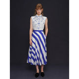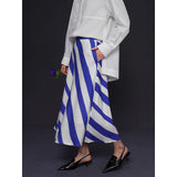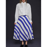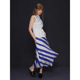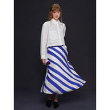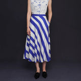 海のさざ波を想起させる、陽気さと少しの奇抜さのある斜めストライプ柄のフレアスカート。しっかりとした張りの生地により、落ち感のあるシルエットを描きつつも、美しいシルエットをキープしてくれる。斜めに流れるようなブルーとホワイトのストライプ柄が、まるで海中の潮流や波を思わせるリズムを生んでいます。