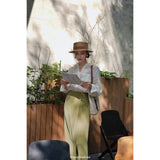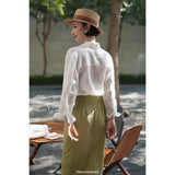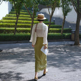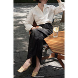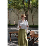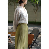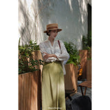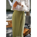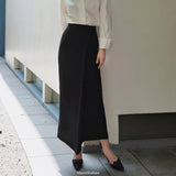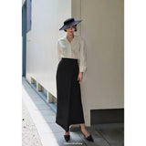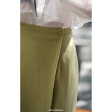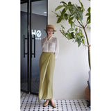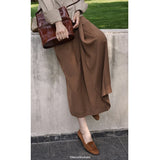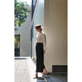 一枚の布を巻き付けているように見えるロング丈のラップスカート。フロントで折り返されたデザインで、ゆったりとしたシルエットながらも、洗練された上品さがあります。なめらかに揺れるドレープ感も魅力的。