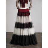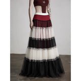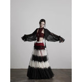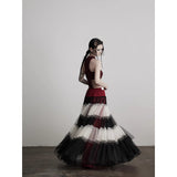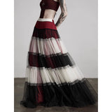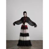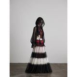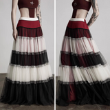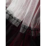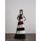 皇后の気品と少女の夢をひとつにした、ドラマティックなグラデーションスカート。まるで薔薇の花びらが重なったような、優雅で威厳ある佇まいを演出してくれる。深紅・黒・アイボリーの3色が交互に重ねられ、柔らかなチュール素材で構成された段状のデザインが特徴的。透け感のあるチュールが幾重にも重なり、ボリューム感と軽やかさを演出しています。