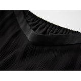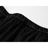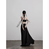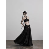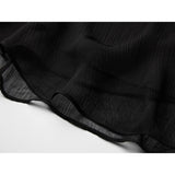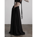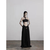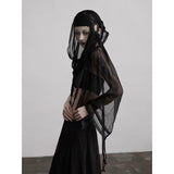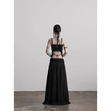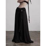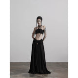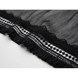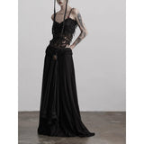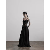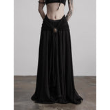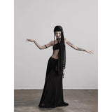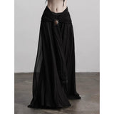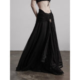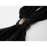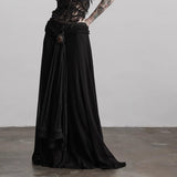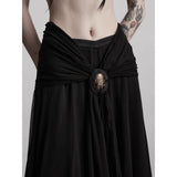カメオブローチが妖艶に引き立つ、ドレープデザインのゴシックロングスカート。流れるようなシフォン素材に、ウエスト部分を重ねたドレープと中央の装飾ブローチが印象的で、ミステリアスかつクラシカルな存在感を放つ一着。裾のレーストリムも繊細で、動きに合わせて優雅に揺れます。