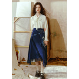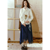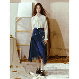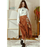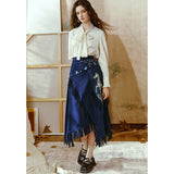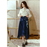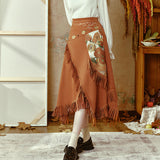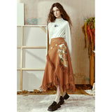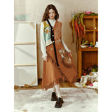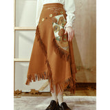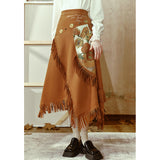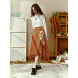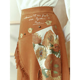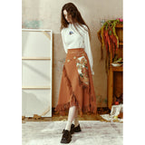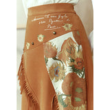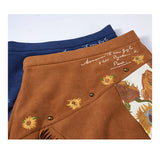 ゴッホが描いた『花瓶の向日葵』と『馬の石膏像』にオマージュを捧げるアシンメトリーなスカート。サイドに鋲が留められており、装飾されたフリンジが特徴的。大胆な構図と美しい絵画に魅了される。