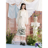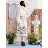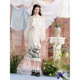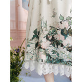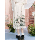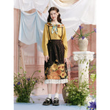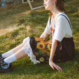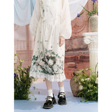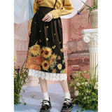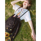 ゴッホが描いた『花瓶の向日葵』と『薔薇』を大胆に描いたストラップスカート。裾部分には白地のレース刺繍が装飾されており、絢爛に咲き誇る花々との組み合わせが優美な雰囲気たっぷり。美しき絵画を堪能してみて。