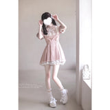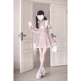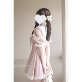 柔らかなピンクのチェック柄がガーリーな印象を与えるワンピース。ヨーク部分にはクラシカルなフリルレースと大きなリボンモチーフがあしらわれ、胸元のパール調ブローチが上品なアクセントに。肩の開きデザインとふんわりとしたパフスリーブが甘さの中にほんのりとした抜け感を演出。裾には繊細なレースが重ねられ、動くたびに揺れるフェミニンなシルエットを描き出します。