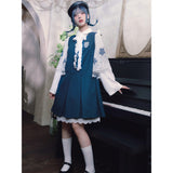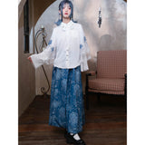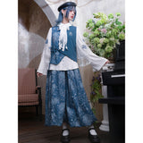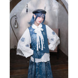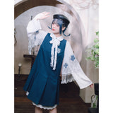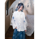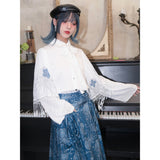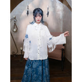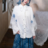 深海から現れ、静かに浮かぶ神秘的なクラゲを描いたダブルスリーブブラウス。袖部分にはフリンジが施されており、優雅な揺れが妖艶な雰囲気を与えます。波紋のように広がる刺繍と、揺れるフリンジが水面の煌めきを思わせ、静かに風を受けて揺れる様は、まるで水中に舞う花の精の羽衣みたい。胸元には波のようなフリルリボンが咲き誇り、クラシカルでありながらどこか儚げな印象を添えています。