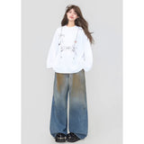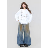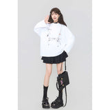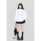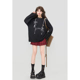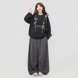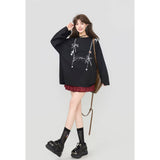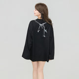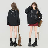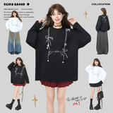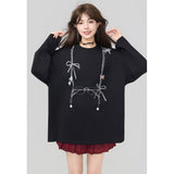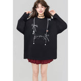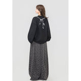 しっとりと落ち感のあるブラック地に、眼鏡と白いリボンと連なるビーズが前後に描かれたスウェット。胸元ではアクセサリーを重ねたように、背中では結び目の余韻だけを残すように静かに揺れ、たっぷりとした身幅と長めの袖が身体を包み込みながら、甘さと影のあるロマンティックさを併せ持っています。