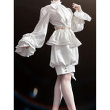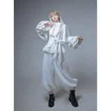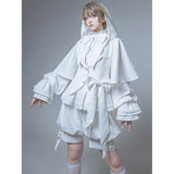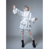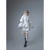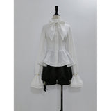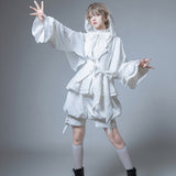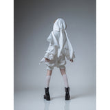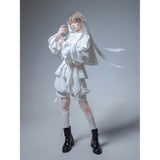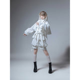 ウサ耳のフードが付いたジャケットと、ボリュームのある袖と大きめのリボンが可愛らしいブラウス、ふわりと膨らんだハーフパンツと、七分丈のクロップドパンツ。ゆるっとカジュアルに着こなしてみて。ボーイッシュな雰囲気と可愛らしさを兼ね備えた格調高きアイテム。
