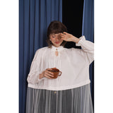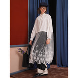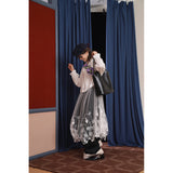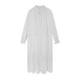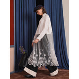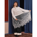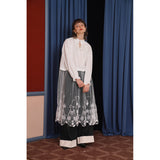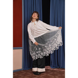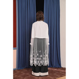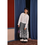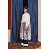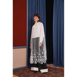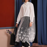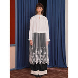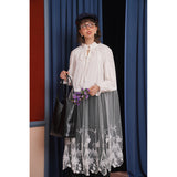 スカート部分に施された透明感のある刺繍入りのチュールが繊細で華やかな印象を与えるワンピース。風に吹かれて舞う楓の葉や、小さな宝石のようなベリーの実をモチーフにした刺繍。上半身部分はシンプルなホワイトブラウスとなっており、フロントのリボンやギャザーのディテールが柔らかい雰囲気を演出しています。