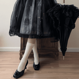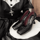 ヴァンプ部分に編み上げが装飾されたスクエアトゥヒールパンプス。トップラインはコウモリの羽を想起させるような独創的なデザイン。アンティーク感漂うスクエアトゥも特徴的。西洋の古城に住まうミステリアスなお嬢様に。