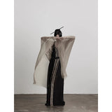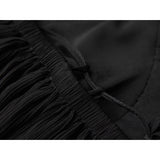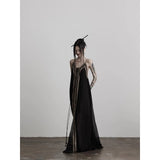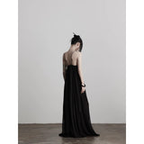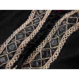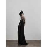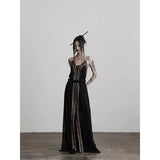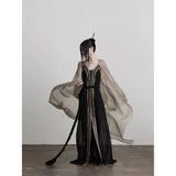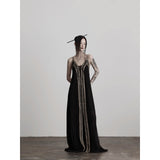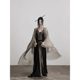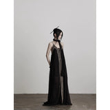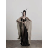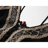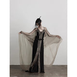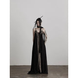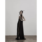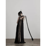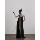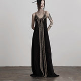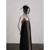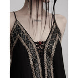 幾何刺繍が際立つ、儀式めいた気配を纏うキャミソールワンピース。繊細な透け感と重厚な装飾のコントラストが印象的で、中央に走る刺繍レースと編み上げディテールが神秘性を演出。赤いビーズがさりげなく添えられ、オリエンタルな儀式服を思わせる静謐で荘厳な佇まいが漂います。