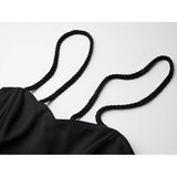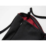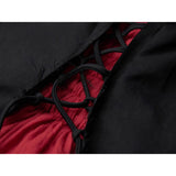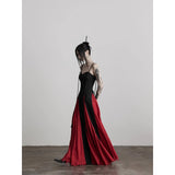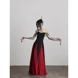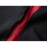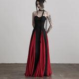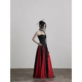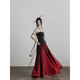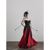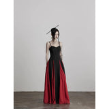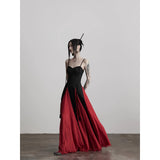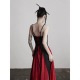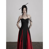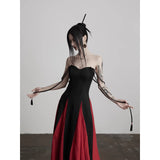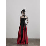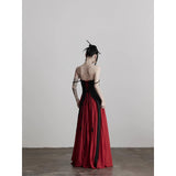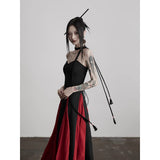 紅と黒が織りなす大胆なコントラストが、まるで舞台上の主人公のような存在感を放つキャミソールワンピース。上半身はコルセット風のフィットシルエットで、すらりとしたラインを際立たせつつ、スカート部分には揺れるプリーツが取り入れられ、歩くたびに炎のように広がる赤が視線をさらいます。